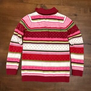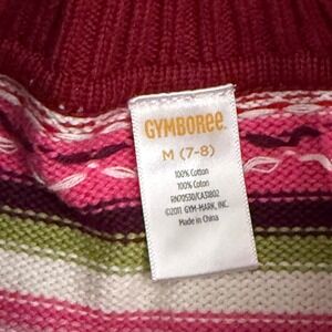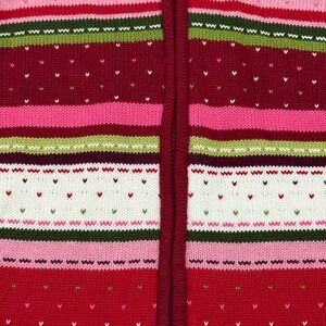 Gymboree cardigan, a delightful explosion of color and pattern. This knit sweater features a full zip-up front, making it easy to layer for added warmth and style. The playful stripes in shades of pink, red, green, and white are interspersed with sweet heart details, adding a touch of whimsy to any outfit.