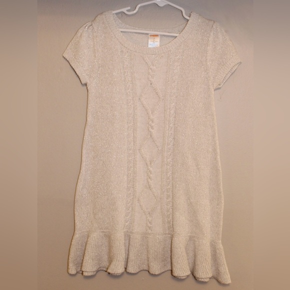 The Gymboree dress in tan and cream is a casual yet stylish piece, featuring a ruffled ribbed design that adds texture and charm. With its short sleeves and crew neck, this sweater-style dress is perfect for relaxed outings. The soft knit fabric ensures comfort, making it a versatile addition to any wardrobe.
