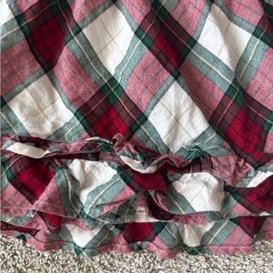 Festive and classic plaid dress from Gymboree in size 3T. Features red, green, and white tartan plaid with long sleeves, a gathered waist, and double-layered ruffle hem. Perfect for holiday photos, Christmas parties, or winter celebrations. From the Christmas Cabin collection. Excellent condition.