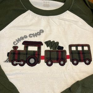 These pjs from Gymboree are loose fitting. The plaid train on the shirt is embroidered with matching plaid wide legged bottoms. Good condition from a smoke free home.