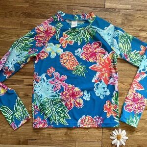 The Gymboree Tropical Rash Guard in size 10 features a vibrant multicolor design suitable for boys. This regular-sized rash guard is ideal for protecting young ones from the sun while they enjoy water activities. The tropical theme adds a fun and stylish element to this swimwear piece, making it a practical and fashionable choice for kids aged 10-12.