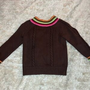 Chocolate brown w/ multicolored striped pattern along collar and cuffs; mock neck; long sleeves; wide ribbed knit along collar, cuffs and hem; straight hem