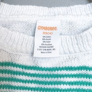 Lightweight, white sweater with green, pink, and blue stripes. The left shoulder is adorned with two silver buttons.