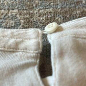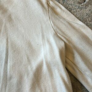 This has only been worn a couple of times and is in pretty perfect condition. A very very small hole is pictured, not even noticeable with the naked eye. Super cute for winter, no rips tears or stains, button is in tact, smoke free and pet free household.