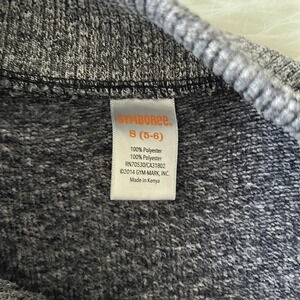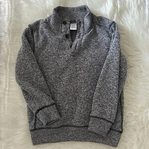This is a Gymboree knit sweater in a size small which would fit a 5 to 6. It’s 100% polyester. Can be machine. Washed cold. Has three buttons at the neck.