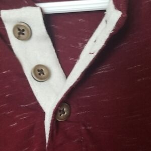 Burgundy with a little cream color space dye look. Cute little half button feature at chest. There is a small hole in front, see pic. This was worn maybe a handful of times or less. Smoke free home