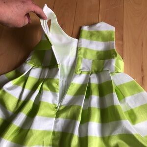Gymboree lime and white striped formal spring Easter girls dress. Adorable striped dress with vertical bow detail in front. Skirt part of dress is pleated. Layered lining. Zipper in back. Toddler girl size 2T. See pics for measurements. Excellent condition, with no noted flaws. Same day ship!