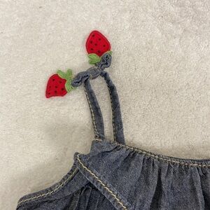 Euc pfsf no stains, tears, holes, fade or wash wear light weight denim chambray with ruffles on the bodice and strawberries on the spaghetti straps buttons in the back size 4t hard to find dress Burst of spring collection