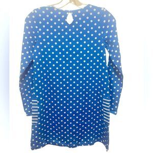 Long sleeve polka dot dress with striped big pockets. Cotton and machine washable.