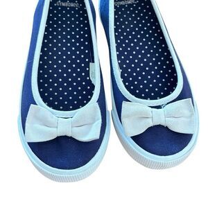 Navy blue slip on sneakers with white piping and bow. In good pre-owned condition. Some wear as shown.