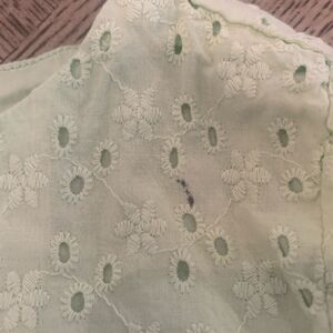 Size 2T fully lined, eyelet dress with ruffle sleeves, small spot on left shoulder