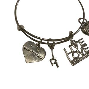 This stylish silver bangle bracelet features gymnastics-themed charms, including heart and inspirational messages. Ideal for gymnastics enthusiasts who appreciate elegant accessories.