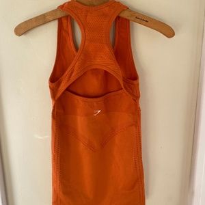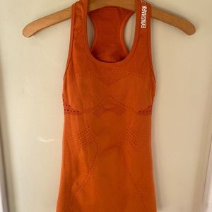 Orange, racer back athletic top with open weave detailing. Pre-owned, good condition. Size xs/sm