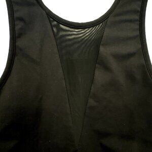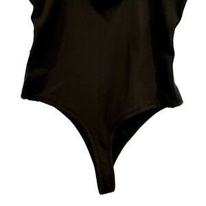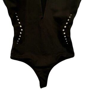 Sleek black bodysuit. Deep V-neck design. Subtle stud accents.