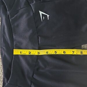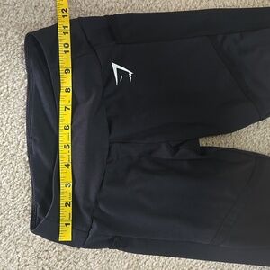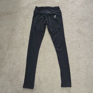 Gymshark black leggings size XS. Very good pre-owned condition. The logo on the hip is cracking but the leggings have no pilling or flaws. Very minor wash wear if any. No pilling in the gusset. These have side pockets. The mesh on the back of the legs is sheer.