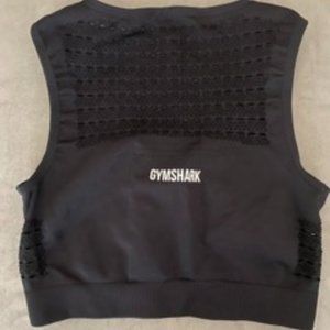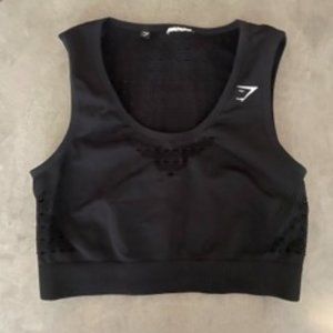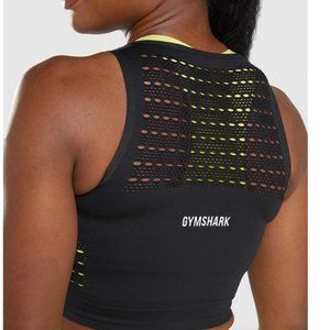 Crop top/sports bra (light support), model is wearing yellow sports bra underneath, eyelet detailing on front/back/side, Fits like a small