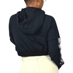 Gymshark hoodie sweatshirt FEATURES brand spell out across the front pocket and down the sleeves. Cropped length. Attached hood. Zipper front neckline. Banded rib cuffs and lower hem.