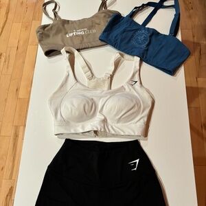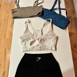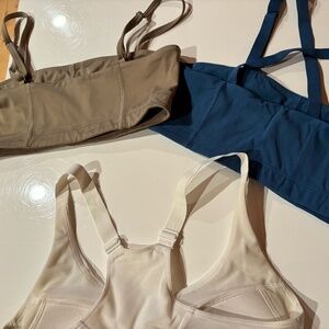 3 sports bras: white, dark slate blue, & tan. All EXTRA SMALL.