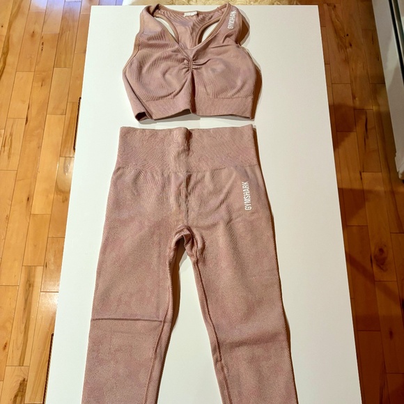 Adapt Leggings: Sweat-wicking fabric, seamless stretch, with the prettiest, pale pink subtle pattern. Ruched detail to butt with an elongated ribbed waistband and printed logo to upper left hip. Adapt Sports bra: Sweat-wicking fabric with pale pink subtle pattern and matching ruching detail on the back.