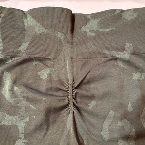 Adapt Leggings: Sweat-wicking fabric, seamless stretch, with all-over camouflage. Ruched detail to butt with an elongated ribbed waistband and printed logo to upper left hip.