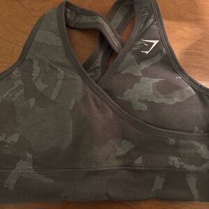 Adapt Sports bra: Sweat-wicking fabric with all-over camouflage and cute, crossover front design.