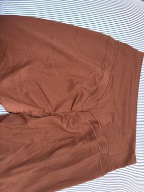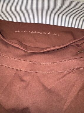 High-waist Gymshark leggings in a warm rust-brown hue. Smooth, stretchy fabric for comfort. Subtle interior scripted detail. Streamlined, minimal design for workouts or errands.