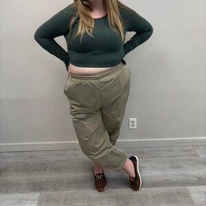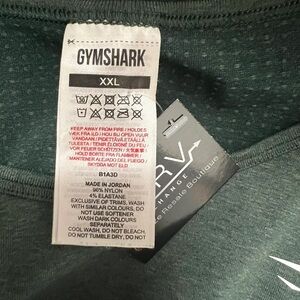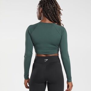 This crop top is moisture wicking and seamless! It has a round neckline and long sleeves with thumbholes. Breathable mesh details throughout keeps you cool. Made with a nylon fabric blend. It's in a hunter green color. Size XXL.