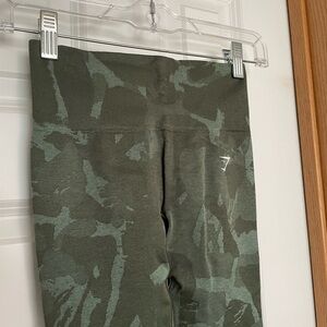Like new pair of green camo patterned leggings from Gymshark in a size XS. These leggings are a seamless style and have a unique scrunch detail on the rear. No stains or flaws!