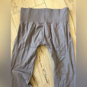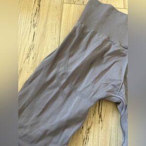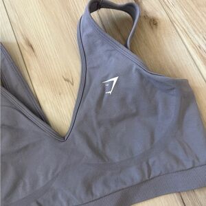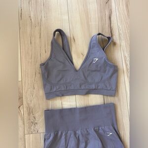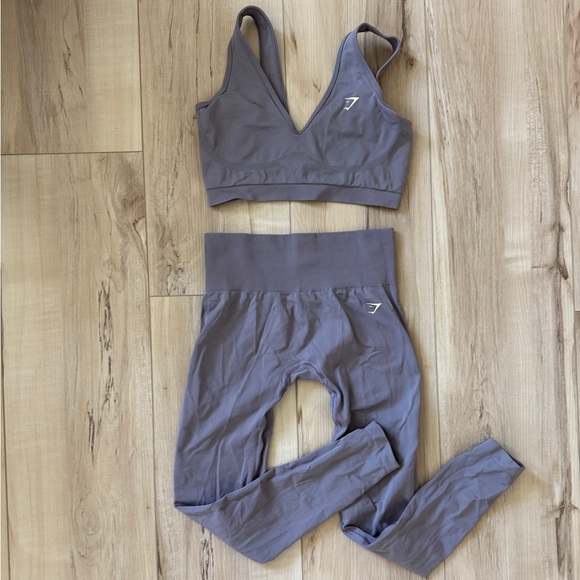 Matching Gymshark two-piece seamless set. V-neck sports bra with supportive underband. High-waist leggings for a smooth fit. Stretchy, soft fabric for workouts and recovery. Subtle Gymshark logo accents on both pieces.