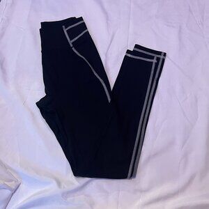 High waisted, black leggings with white stitching feature.