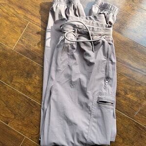 Comfortable Gymshark tan joggers with drawstring waist. Perfect for casual wear. Size medium with zipper side pockets and zipper cargo pockets. Elastic waist measures 13.25 inches inseam is 29.25 inches. Great fall color! Material tag has been removed, but they are a stretchy nylon fabric.