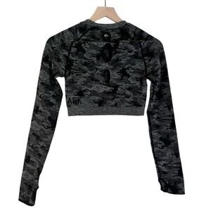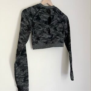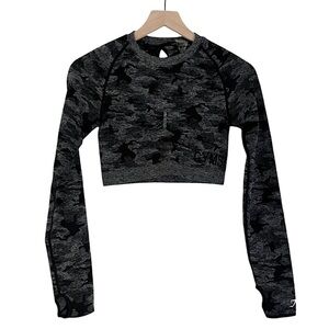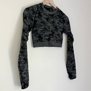 Gymshark women’s camo seamless long sleeve crop top in grey and black. Size medium.