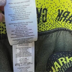 Gymshark. Black with green muscle defining design on front and back. 8” rise and 24” inseam. Measurements shown in photos.