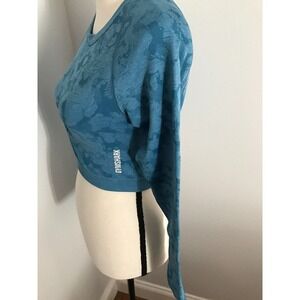 Gymshark Women's Top Blue Camo Long Sleeve Ruched Chest Cropped