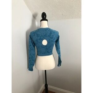 Gymshark Women's Top Blue Camo Long Sleeve Ruched Chest Cropped - Size Medium