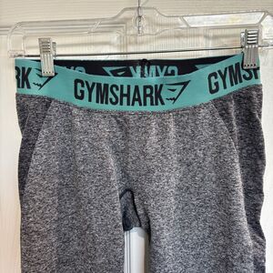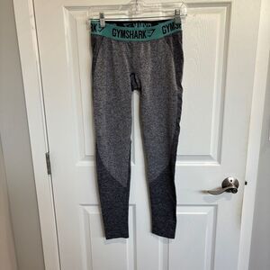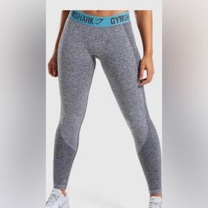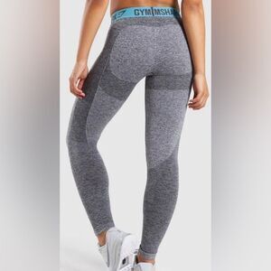 Flex legging in charcoal and teal with gymshark all around the band. Dry, moisture management.
