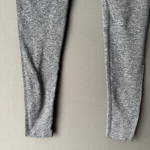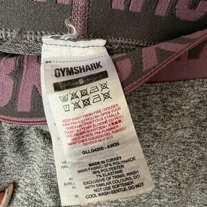 These are pre-owned Gymshark leggings, size small. The leggings are gray with a heathered texture and a purple waistband featuring the Gymshark logo. The material composition is 57% polyamide, 36% polyester, and 7% elastane. The leggings are full-length and have a fitted silhouette. There are no visible stains, tears, or significant signs of wear. The overall condition is good.