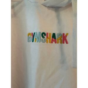 White multicolored embroidery of the word Gymshark. The shirt was self cut and is cropped. There are uneven spots in the bottom. It can be cleaned up by anyone with a level or ruler. No stains or flaws other than the young girls cutting skills. Size Medium Smoke free pet friendly.