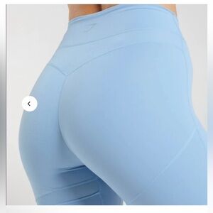 These Gymshark leggings in a calming blue hue offer a sleek, form-fitting design with a high waistband for added support. Crafted from a stretchy, athletic material, they ensure flexibility and comfort for both workouts and casual outings.