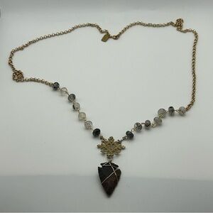 Keywords: Beaded necklace, Gold necklace, Black quartz pendant, Arrowhead charm, Gold-toned jewelry, 20-inch necklace, Lobster clasp necklace, Unbranded jewelry, Pre-owned necklace, Quartz stone necklace, Gold beaded necklace, Black stone necklace, Metal and quartz necklace, Charm pendant necklace, Fashion jewelry, Boho