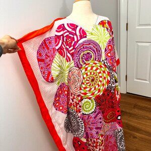 Just wow! Even Mrs. Roper would approve of this 70's mod inspired kaftan. Orange, pinks, and greens are the primary colors and they really do pop. Throw this on over just about anything and you have a killer stand out outfit. Would also be a great swim cover up. This is not vintage but it has a fantastic 70's flair. Lightweight silky feel.