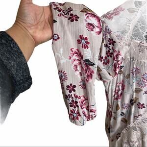 Features- Boho, long sleeve, mandarin collar, open chest, keyhole back, elastic sleeve end, lace trim detail, floral print, button closure at back of neck, longer in back, feminine, flirty