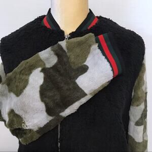 NWT. Faux Fur Bomber Jacket for Women Size L. Black with camouflage sleeves, stripes - green, red, and black banded collar, cuffs and bottom hem, silver zipper front closure, no pockets, soft to touch. Necklace and internal bralette are not included. Pictures are part of description.