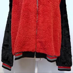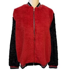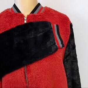 NWT. Faux Fur Bomber Jacket for Women Various Sizes. Red with black sleeves, stripes - black, gray, and red banded collar, cuffs and bottom hem, no pockets, silver zipper front closure, soft to touch. Necklace and internal bralette are not included. Pictures are part of description.