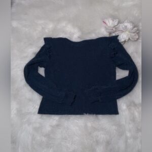 Lightweight sweater. Long sleeves with subtle ruffle details at the shoulders. perfect for layering or solo wear. Deep navy blue pairs easily with denim or skirts.