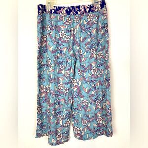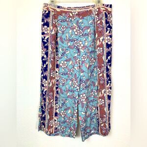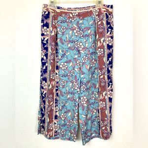 Boho culottes with a floral design. Also called a split skirt, wider legs. Features subtle muted pastels & blue. Crafted by Gypsies & Moondust. Lovely boho floral rayon w/elastic waist. Unique pleat on each side of front. Like new condition. No wear or flaws. Waist is 16” flat rise is 12”