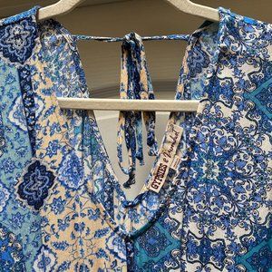 V-neck dress, gently used, Pullover with tie at back neck. Smocked waistline. Gently used.
