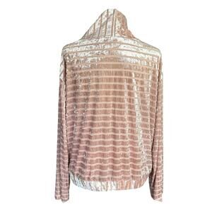 The Gypsies & Moondust velvet burnout striped top in XL is a stylish and versatile piece perfect for various occasions such as travel, parties, or casual outings. The pink and black color scheme with ribbon detailing adds a touch of elegance to the blouse, while the velvet fabric and lightweight design make it comfortable to wear during the warmer seasons. With a round neck, long sleeves, and pullover closure, this top offers a relaxed yet chic fit for women looking for a trendy yet easy-to-care-for wardrobe staple.
