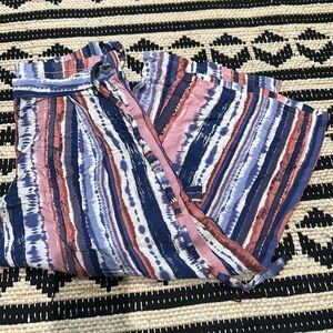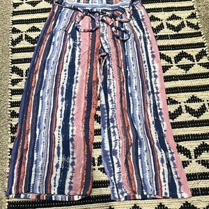 Vibrant striped tie-dye pants with a wide-leg design. Features a comfortable tie waist.