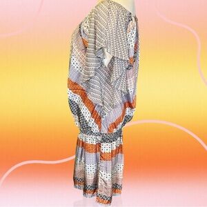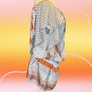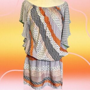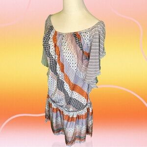 Gypsy 05 Gray & Orange Multi Bandana Print Striped Boho Silk Mini Dress Size M